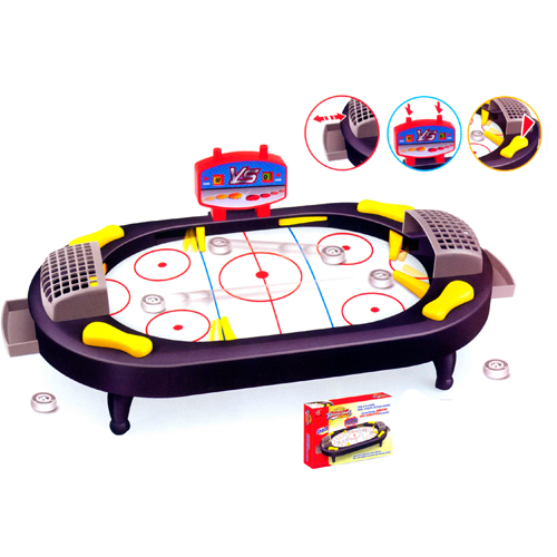 "Мини-хоккей" - настольная игра для двоих участников. Каждый игрок стремится забить шайбу в ворота противника, а так же отражает удары. Игрок, который забил больше шайб, победил. С помощью подсчитывающего устройства можно фиксировать забитые шайбы.