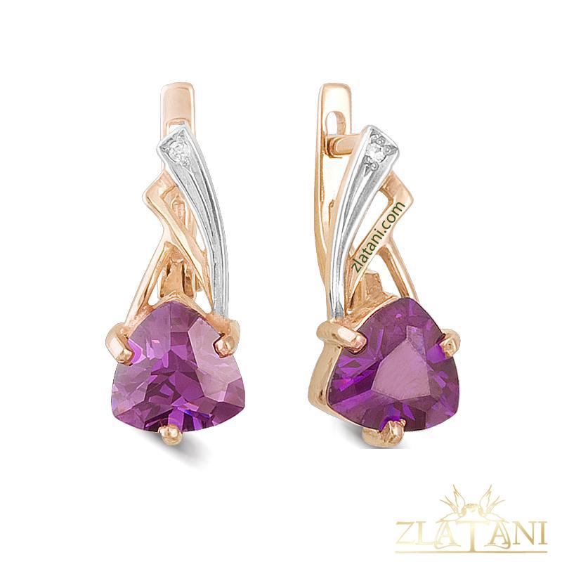 Габаритный размер: 18 мм *8 мм .В серьги вставлены фианиты под аметист огранки триллион размером 9 мм *9 мм .,в количестве 2 штуки .Фианит бесцветный диаметром 1,50 мм .,в количестве 2 штуки.Серьги частично родированные.