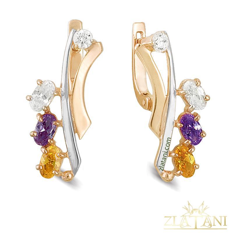 Габаритный размер: 22 мм * 8 мм .В серьгах присутствуют фианит бесцветный огранки овал размером 5 мм * 3 мм .,в количестве 2 штуки.Фианит под аметист огранки овал размером 5 мм * 3 мм .,в количестве 2 штуки.Фианит золотой огранки овал размером 5 мм * 3 мм .,в количестве 2 штуки .Фианит белый диаметром 2,25 мм ,в количестве 2 штуки.Серьги частично родированные.