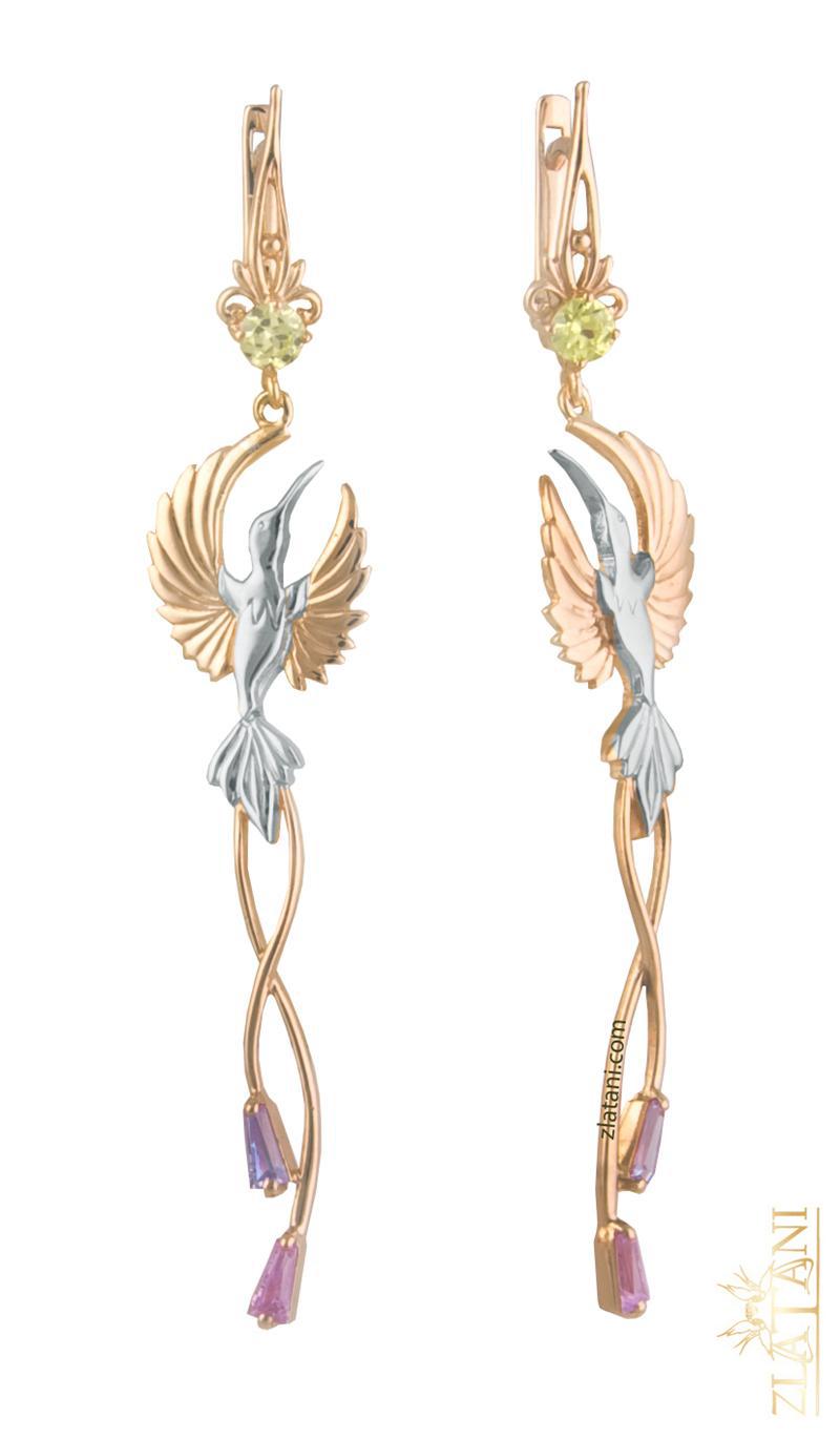 Габаритный размер: 72 мм * 14 мм.Вставки круг под хризолит диаметр 3,50 мм.,количество 2 штуки. Трапеция под аметист и розовый (фианит) размер 5 мм * 2,5 мм * 1,5 мм.,количество 4 штуки. Серьги частично родированные.