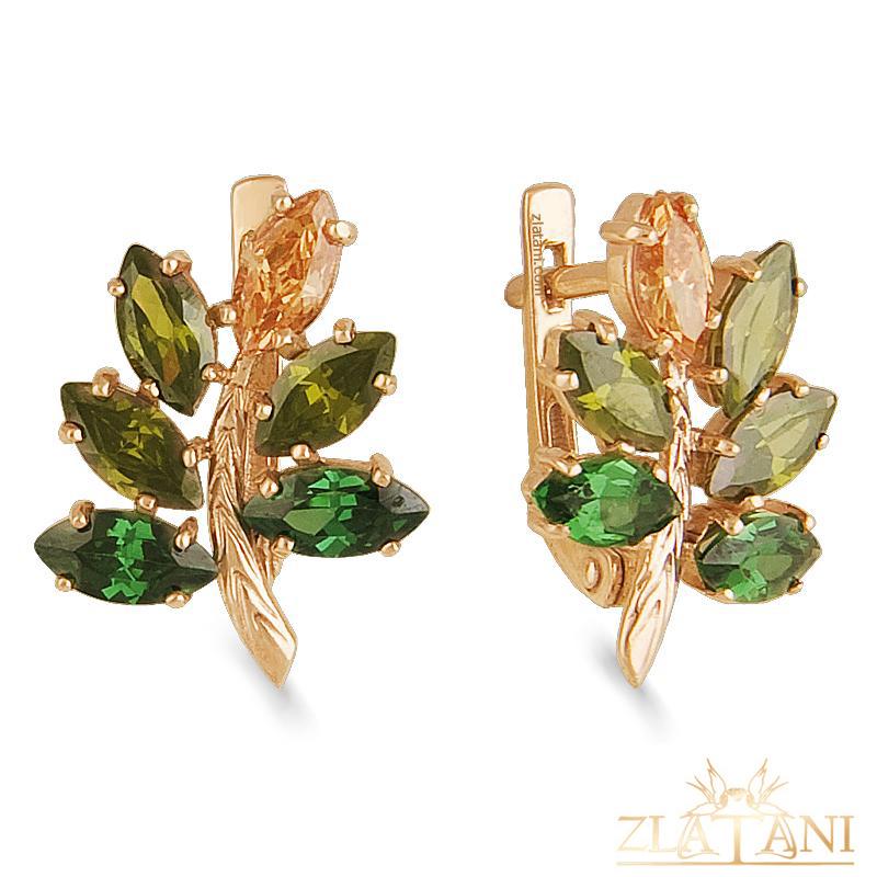 Габаритный размер: 19 мм * 12 мм .В серьги вставлены фианиты огранки маркиз зеленый размером 7 мм * 3,50 мм .,в количестве 4 штуки,фианит оливка размером 7 мм * 3,50 мм .,в количестве 6 штук,фианит золотой размером 7 мм * 3,50 мм .,в количестве 2 штуки.