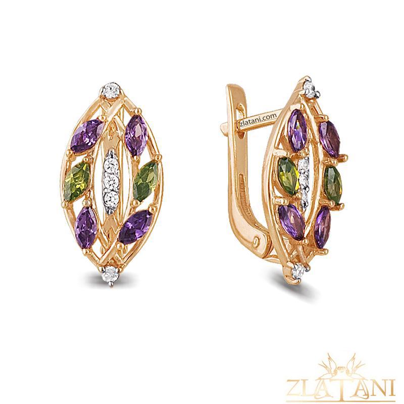 Габаритный размер: 18*9 мм. Вставки маркиз под аметист размер 4 мм *2 мм. количество 8 штук, маркиз фианит под хризолит размер 4 мм *2 мм., количество 4 штуки,фианит бесцветный диаметром 1,0 мм .,в количестве 10 штук.Серьги частично родированные.