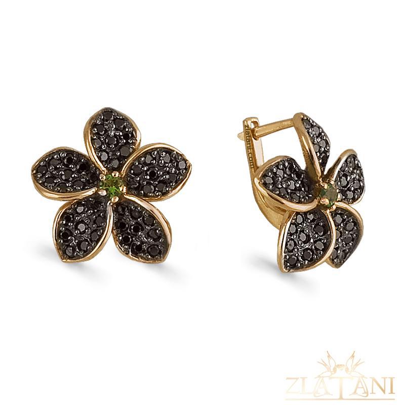 Габаритный размер: 20 мм * 19 мм .В серьгах присутствуют фианиты под хризолит диаметром 3,25 мм .,в количестве 2 штуки.Фианиты бесцветные диаметром 1,75 мм .,в количестве 90 штук.Серьги частично родированные.