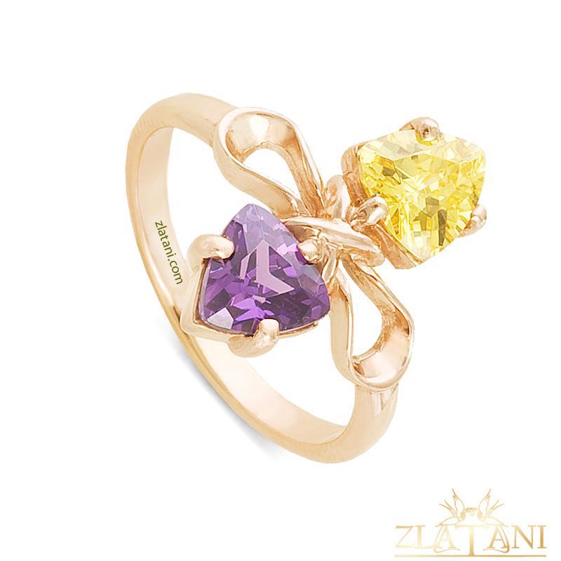 Габаритный размер: в кольцо вставлены фианит под аметист,фианит золотой огранки триллион размером 6 мм *6 мм.,в количестве 2 штуки.