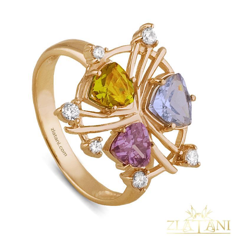 Габаритный размер: 16 мм *17 мм.,в кольцо закреплены фианит лаванда огранки триллион размером 7 мм *7 мм .,в количестве 1 штука,под хризолит огранки триллион размером 6 мм *6 мм .,в количестве 1 штука,под аметист огранки триллион размером 5 мм *5 мм .,в количестве 1 штука,фианит бесцветный диаметром 2,0 мм .,в количестве 5 штук,диаметром 1,75 мм .,в количестве 1 штука.