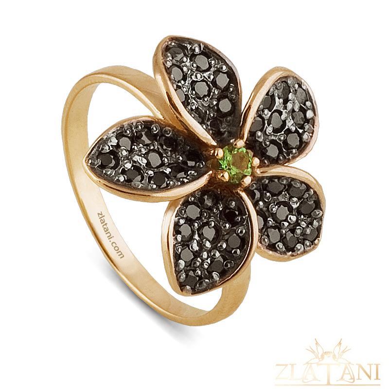 Габаритный размер: 16 мм *19 мм .,в украшение вставлены фианит черный диаметром 1,75 мм .,в количестве 45 штук,фианит под хризолит диаметром 3,25 мм .,в количестве 1 штука.В кольце присутствует элемент родирования