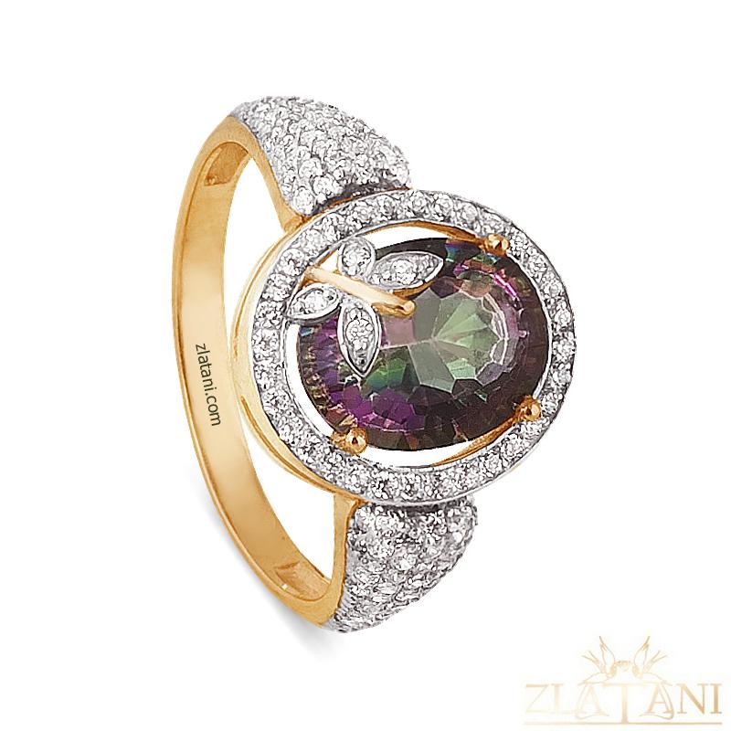Габаритный размер: в украшение вставлены фианит мистик огранки бриолет овал размером 10 мм *8 мм .,в количестве 1 штука,фианит бесцветный диаметром 1,0 мм .,в количестве 120 штук.В кольце присутствует элемент родирования.