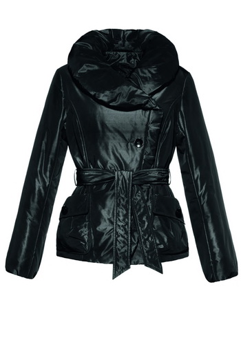 синтепоновая куртка на поясе, с однобортной застежкой на крупные пуговицы. Романтичный образ создают: рюша, идущая вдоль борта, объемный воротник, дополнительный объем по низу рукава и металлическая нашивка на рукаве с многочисленными стразами. Нарядный образ подчеркивается блестящей тканью с тонкими полосами оттенка основной ткани.