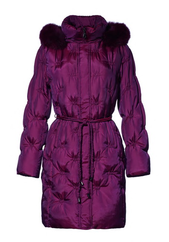 пальто прямого силуэта с капюшоном, отороченным мехом. Пояс выполнен в виде двойных поясков образующихся плотно присборенной тканью. Фактурная поверхность ткани создана за счет небольших сборок, располагающихся в определенном порядке и придающих иллюзию ромбовидного рисунка на ткани.