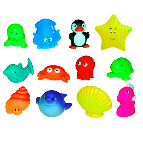Игрушки-брызгалки выполнены из мягкого, яркого пластика. В комплекте: 12 игрушек в сумке. Размер упаковки: 25х15х7 см. Рекомендован от 10 месяцев. "