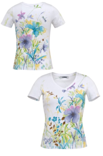 футболка с коротким рукавом, с V-образным вырезом горловины. Растительный принт, имитирующий акварельное нанесение цвета, выполнен на полочке и спинке, для рукавов использовалась ткань с минимальными фрагментами принта.Цвета-белый,42-54,цена-820р.