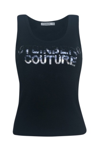 майка на широких бретелях с углубленным вырезом горловины. Мерцающая надпись создана благодаря постепенному переходу цвета пайеток от светлого к темному. Для данной модели используется материал с переплетением RIB.Цвета-черный,фуксия,42-54,цена-950р.