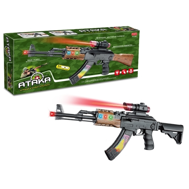 Игрушечный автомат из прочного пластика выполнен очень детализировано, все детали хорошо проработаны и в игре он очень реалистичен, ведь встроенный звуковой модуль издает звуки стрельбы и вибрирует, имитируя отдачу от выстрела. Кроме того, автомат оснащен подсветкой на рожке и на боковой части ствола, а также красный светодиод установлен в надствольном прицеле. Свет, звук, вибрация.