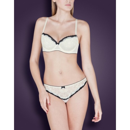 - Бюстгальтер из кружева и сетки, декорированный контрастным узким кружевом и атласным бантиком.