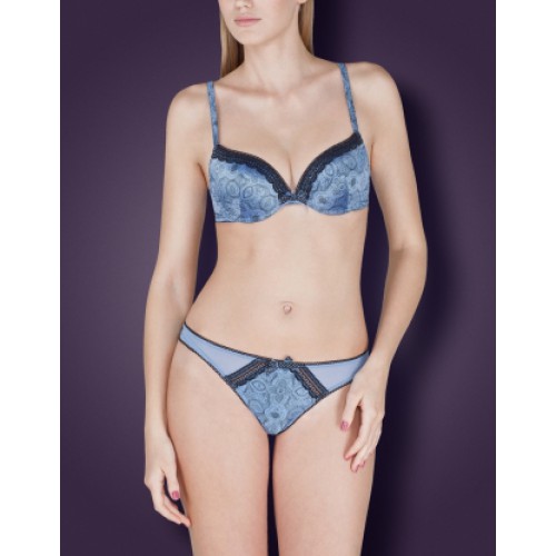 - Трусики-стринг из атласной принтованной ткани и эластичной сетки, декорированные узким кружевом.