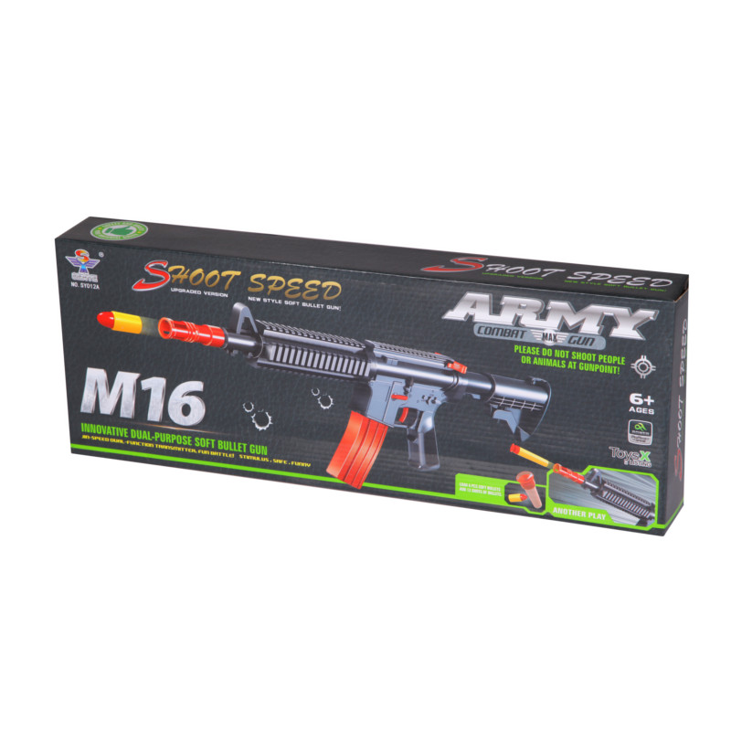 Оружие 2 в 1, стреляющее пластмассовыми патронами с резиновой пулей или поролоновыми патронами с присоской (NERF). При выстреле вылетает патрон целиком. Размер патрона: длина 2.5 см, диаметр - 1 см. наконечник (пуля) из мягкого матрериала. В съёмный магазин заряжается 3 патрона.Взвод механизма - отведением рычага сзади. Дальность стрельбы - примерно 12 метров. NERF - 8 метров