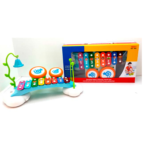 Ксилофон - 8 пластин, колокольчик на подвеске, 2 мини барабана