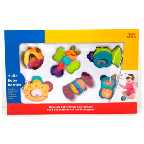 Погремушки: шар с маленьким гремящим шариком внутри, бубен, пчёлка: крылья-прорезыватели, голова и шарик снизу вращаются (с трещоткой), труба: кнопки сверху-пищалки, конфета - трещотка (вращаются боковые части), телефон-погремушка с кнопкой, издающей щелчки.