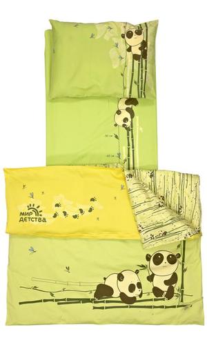 Для изготовления комплекта используется специальное полотно (хлопок + бамбук). Наволочка на молнии. Пододеяльник на молнии имеет изнутри завязки, которые легко и прочно фиксируют одеяло. Трикотажная простыня легко натягивается на матрас, на простыне имеется веселый ростомер.