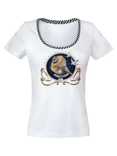 Футболка с коротким рукавом и круглым вырезом горловины. Принт «Морская ракушка» выполнен различными техниками и дополнен стразами SWAROVSKI.