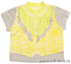 Основная ткань - хлопок с кружевным раппортом, выполненным водной печатью. Воротник-стойка с жабо и рюшей. Центральная застежка - планка на пуговицы.