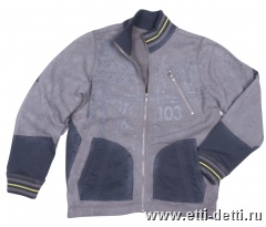 Трикотаж, окрашенный под вареную джинсовую ткань. По полочке и спинке - рисунок, выполненный с помощью вытравки. Воротник и низ изделия из вязаного трикотажа.