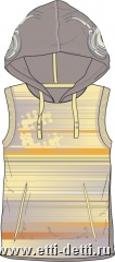 Трикотаж трех цветов. Проймы обработаны рибаной. Карман-кенгуру. На капюшоне принт - имитация наушников.