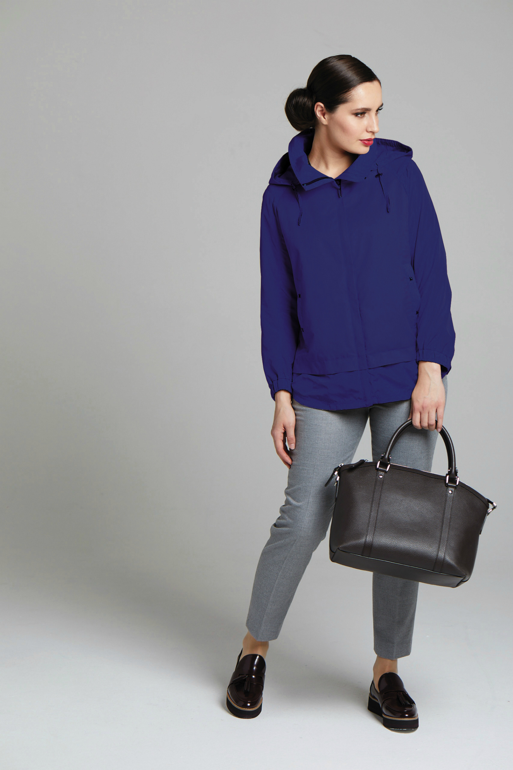 Летний жакет со съёмным капюшоном полуприлегающего силуэта. Изделие выполнено в комбинации двух видов ткани: плотный хлопок и лёгкая плащёвка в цвет. Карманы декорированы металлической фурнитурой цвета " тёмный никель". Застёжка молния переходит на воротник и позволяет менять его форму от плосколежащего до стоячего. Объём спины регулируется кулиской и фиксаторами с внутренней стороны изделия. Низ рукава оформлен манжетой с внутренней резинкой, что позволяет регулировать длину рукава.