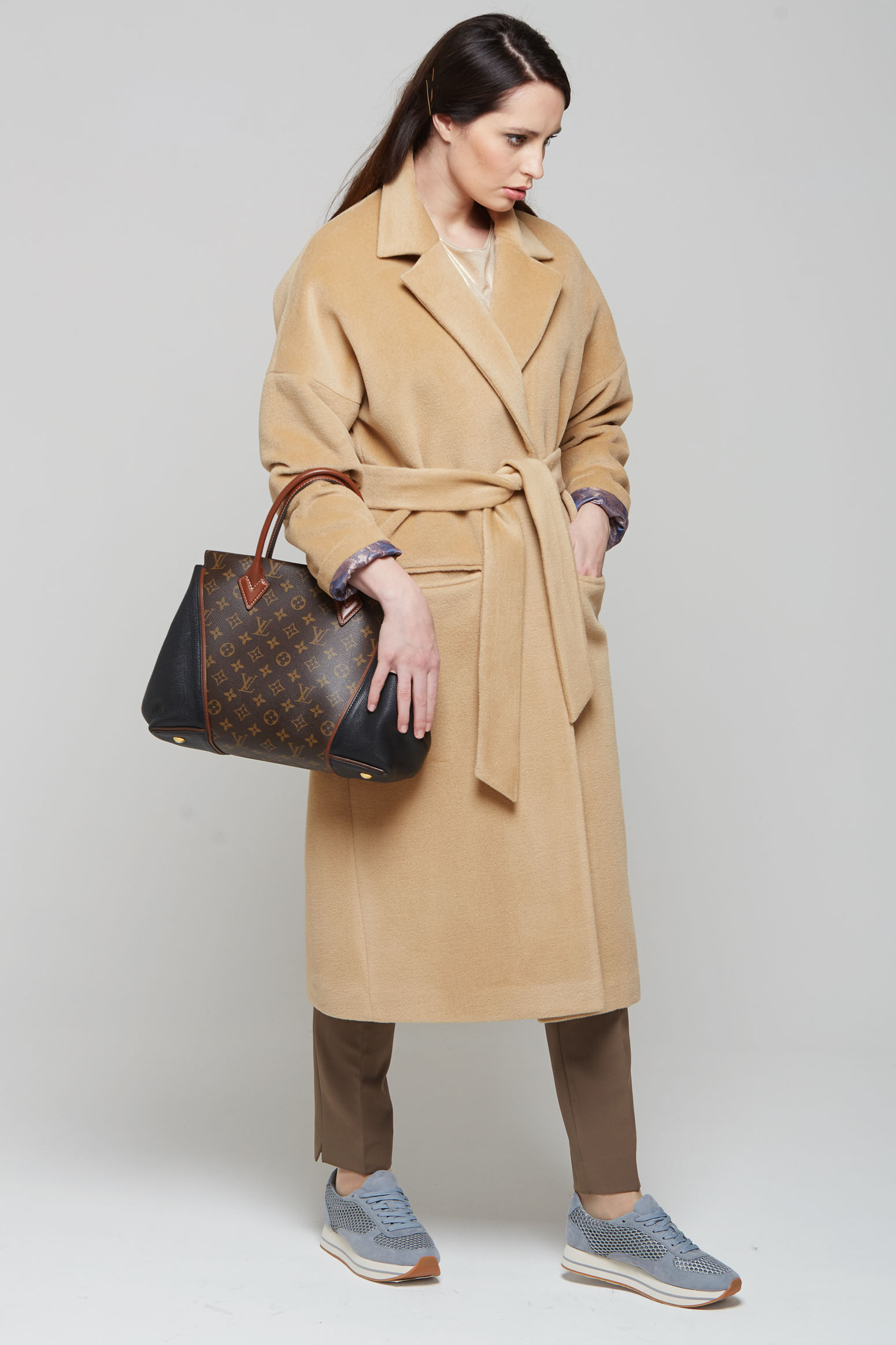 Пальто классическое со спущенным рукавом. Свободный крой, с поясом. 80% шерстяной ткани с добавлением благородных составов.