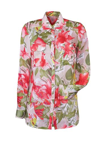 Рубашка прямого силуэта на кокетке и застёжкой на петли и пуговицы. Изделие украшают накладные карманы со складками и клапанами. Паты на рукавах позволяют фиксировать их длину. Разрезы в боковых швах дают дополнительную свободу по бёдрам.