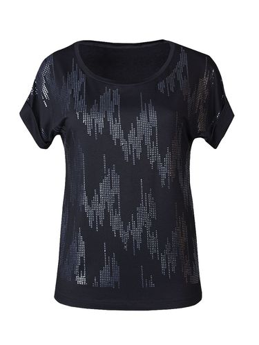 Футболка свободного кроя с цельнокроеными короткими рукавами и отворотами , с круглым вырезом горловины. Перед изделия декорирован графическим рисунком из пайеток , напоминающим мерцание капель дождя.