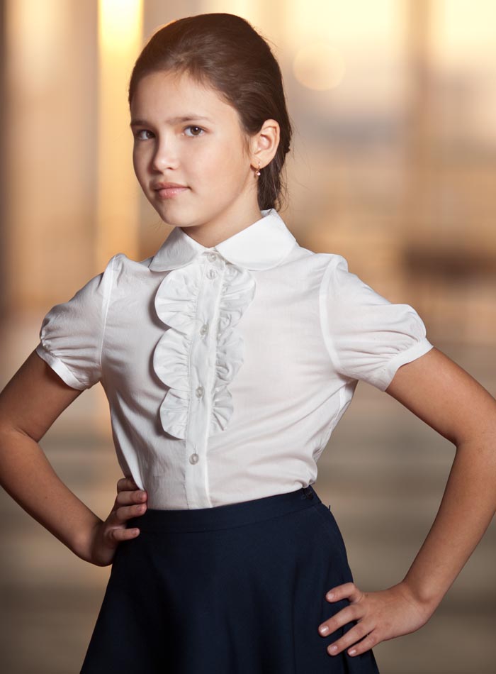 Блуза прямого силуэта, с центральной застёжкой на планке. Воротник на отрезной стойке с закруглёнными концами. Рукав короткий «фонарик», по низу бейка. На полочке декоративная деталь в виде полукруга.
