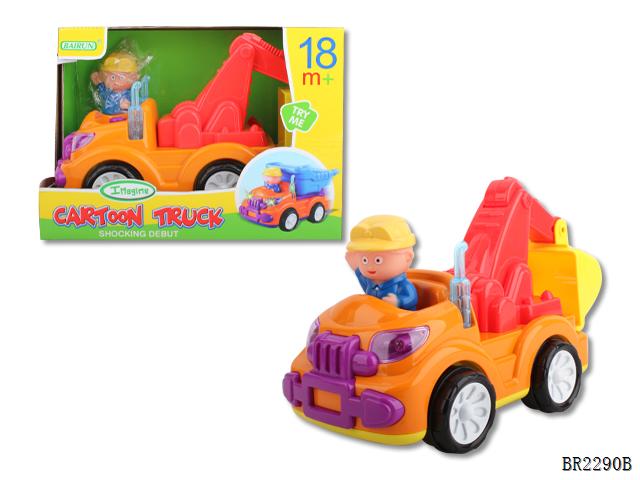 Шофер может вылезать из машинки, а если его посадить на рабочее место и нажать на него, экскаватор начинает движение.
